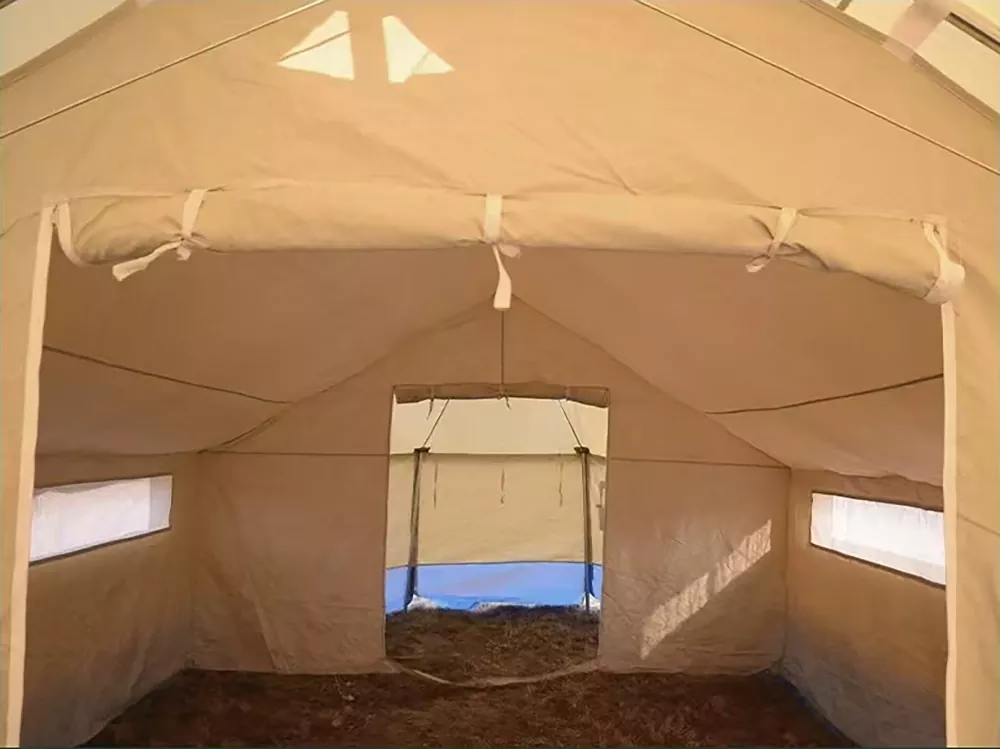 Lub tsev pheeb suab sab nrauv yog ua los ntawm polyester-paj rwb los yog HDPE-coated npuag, muab cov dej tsis zoo, nplaim hluav taws kub, thiab UV-resistant zog. Cov ntawv hauv av yog ua los ntawm cov thickened polyethylene, zoo thaiv cov av noo thiab txo qhov kev pheej hmoo ntawm kab tsuag. Ob lub tsev pheeb suab sab nrauv thiab hauv qab muaj qhov ntsuas dej tsis zoo tshaj 3000mm, tswj kev ua kom qhuav txawm tias nyob hauv dej nag tas mus li. Raws li kev teeb tsa tsim nyog, tag nrho cov qauv tuaj yeem tiv taus cua ntawm kwv yees li 75 km / h, ua tau raws li qhov yuav tsum tau muaj kev nyab xeeb rau tsev neeg cov tsev pheeb suab.